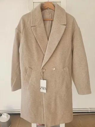 Abrigo de paño de Zara en color beige. Un básico elegante para cualquier ocasión. - Diseño de solapa ancha. - Cierre cruzado con botones. - Bolsillos laterales. - Forro interior.