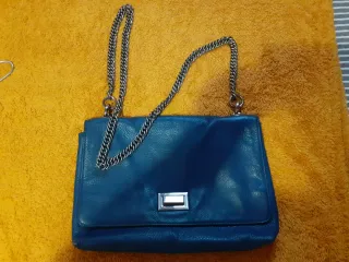 Elegante bolso de piel de Zara en un bonito color azul pavo. Cuenta con una cadena metálica para llevarlo. - Piel de calidad. - Cierre con detalle metálico.