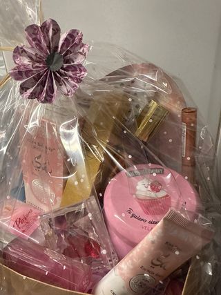 Preciosa cajita de regalo decorada con un lazo rosa brillante. Contiene varios productos de cuidado personal y belleza. - Caja con diseño floral y detalles vintage. - Incluye varios artículos de marcas reconocidas. - Presentación cuidada y lista para regalar.