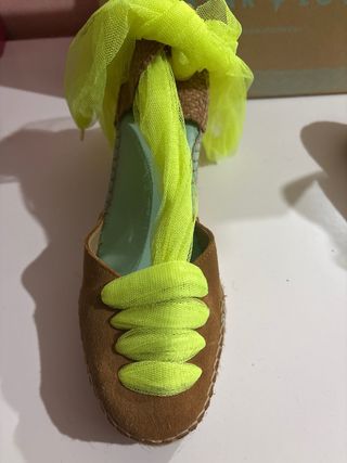 Cuñas de esparto con un diseño llamativo y moderno. - Material exterior de ante. - Detalle de lazo de tul amarillo. - Suela de esparto.
