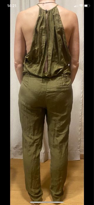 Mono largo de color verde con diseño halter. - Cintura con cinturón anudado. - Piernas rectas. - Tejido ligero.