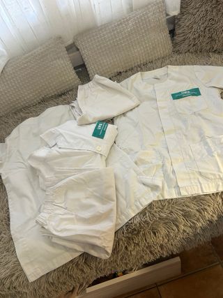 Uniformes de enfermería de la UAB, ideales para prácticas. - Talla pequeña (PP) - Color blanco - Con bolsillo en pecho - Cierre de botones -Incluye bata + 2 pantalones + chaquetas pijama
