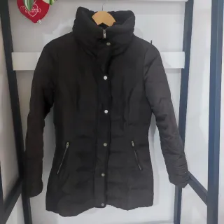 Abrigo acolchado de color marrón chocolate. - Cuello alto con cierre de cremallera. - Cierre principal de botones a presión. - Dos bolsillos laterales con cremallera. - Puños elásticos.