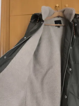 Parka de hombre en tono verde oliva, ideal para el frío. - Forro interior de borreguito. - Capucha con cordones. - Cierre de cremallera y botones. - Bolsillos frontales con solapa.