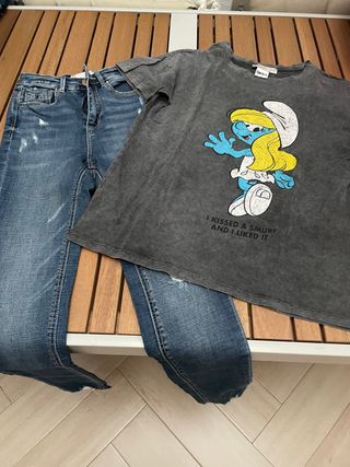 Vaquero azul ( talla 32) y camiseta de Pitufina (talla XS)