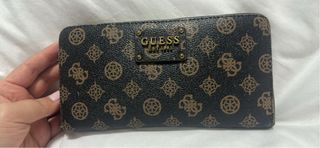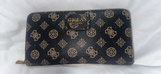 Elegante cartera de cuero con un diseño texturizado. - Con algunas marcas de uso pero en buen estado - Acabado en cuero negro. - Logo Guess grabado en toda la superficie. - Diseño clásico y discreto.