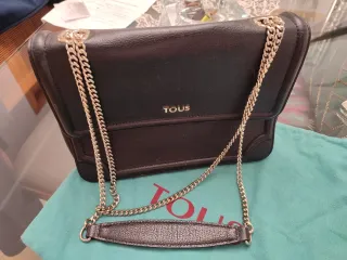 Elegante bolso Tous de piel en color negro con detalles de cadena dorada. - Diseño con solapa. - Asa de cadena. - Logo de la marca en la parte frontal.
