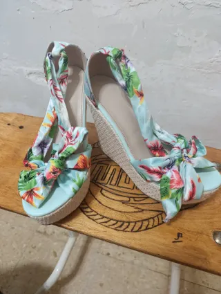 Sandalias de cuña con un diseño floral vibrante y atrevido. Perfectas para añadir un toque de color a tu look. - Estampado tropical multicolor. - Cierre con lazada. - Plataforma y cuña.