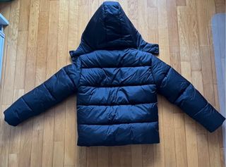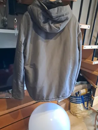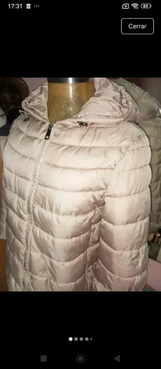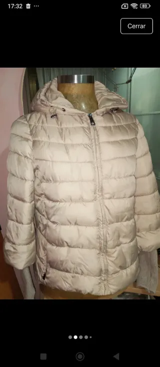 Chaqueta acolchada de plumas en color beige. Es una prenda ligera y cálida, perfecta para el frío. - Diseño con capucha. - Cierre de cremallera frontal. - Bolsillos laterales. Tiene un agujero para sacar el dedo para aguantar el fruo