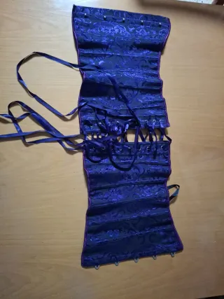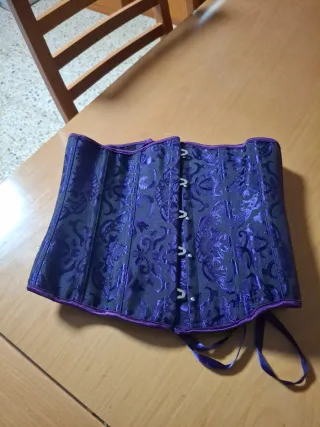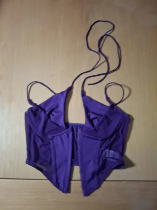 Precioso corpiño con un diseño elegante y llamativo. - Tejido con estampado floral. - Cierre de cordones en la espalda. - Detalle de ribete morado.