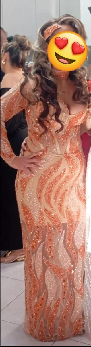 Elegante vestido de fiesta con un diseño llamativo. - Diseño con escote. - Mangas largas. - Adornado con piedras manguito y aplique para pelo