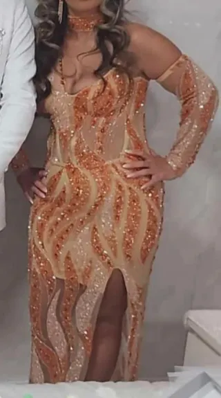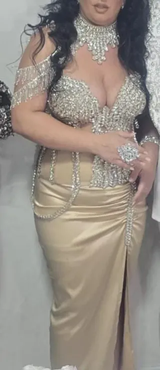 Elegante conjunto de dos piezas. - Corpiño con pedrería y detalles de pedrería. - Falda larga con abertura y detalle de pedrería. - Incluye collar y brazalete a juego.