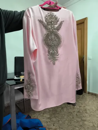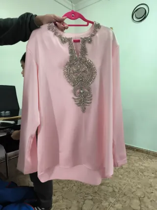 Elegante camisa rosa con un diseño de pedrería plateada en el cuello y el pecho. - Cuello redondo con escote en V. - Manga larga. - Adorno de pedrería plateada. - Color rosa.