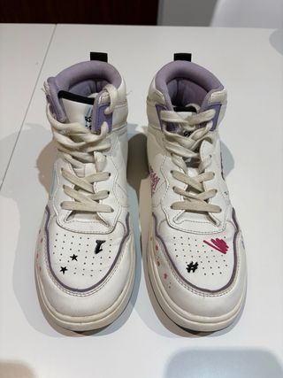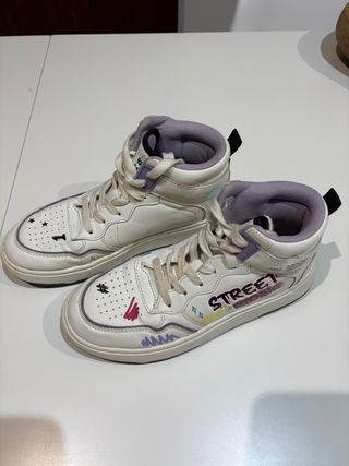 Zapatillas deportivas altas de Zara para niña. - Diseño blanco con detalles en morado y dibujos. - Cierre con cordones. - Estilo urbano.