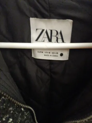 Chaqueta de Zara con un diseño tweed muy llamativo. - Tejido texturizado con hilos negros y blancos. - Cierre de botones. - Capucha integrada. - cierre cremallera