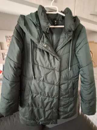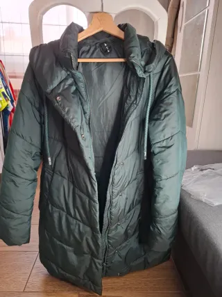 Chaqueton largo acolchado, del corte ingles, poco usado y en buen uso, no tiene roces. Medidas en la fotos porque pone talla S pero es una L, mas o menos. - Color verde tornasolado. - Cierre doble: cremallera y automaticos - Capucha ajustable con cordones. - Bolsillos laterales.