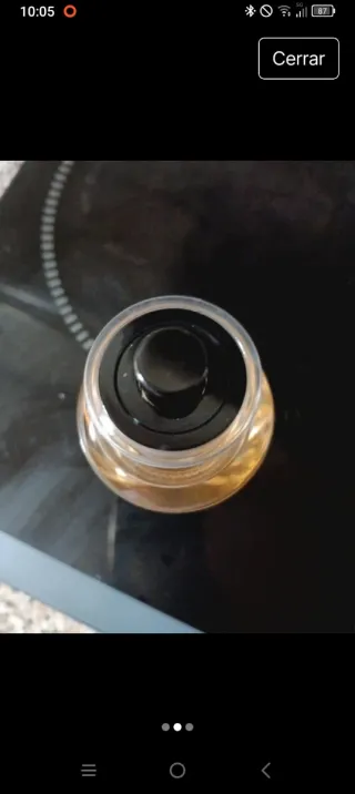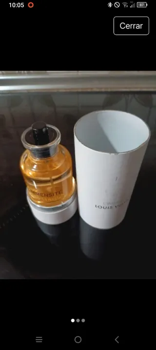 Perfume Louis Vuitton Immense en color dorado. Se vende a estrenar, pero tiene un pequeño defecto. - Envase de cristal con líquido dorado. - Tapa negra y detalles plateados.