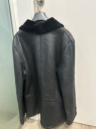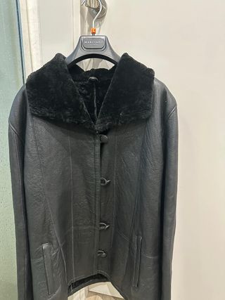 Elegante abrigo de piel de borrego en color negro. - Cuello de borrego. - Cierre de botones. - Bolsillos frontales.