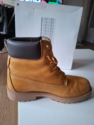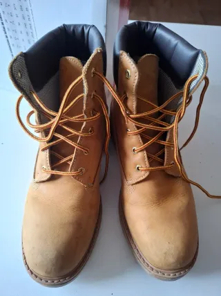 Botas de estilo clásico Timberland. Estan muy nuevas y se ve en el poco desgaste de las suelas. Tienen pequeñas marcas de uso por el tipo de piel. - Material exterior de cuero. - Cordones naranjas. - Suela de goma resistente.