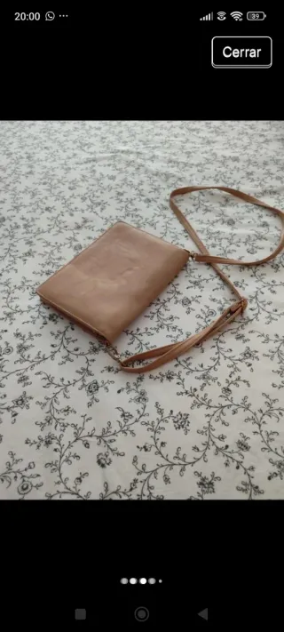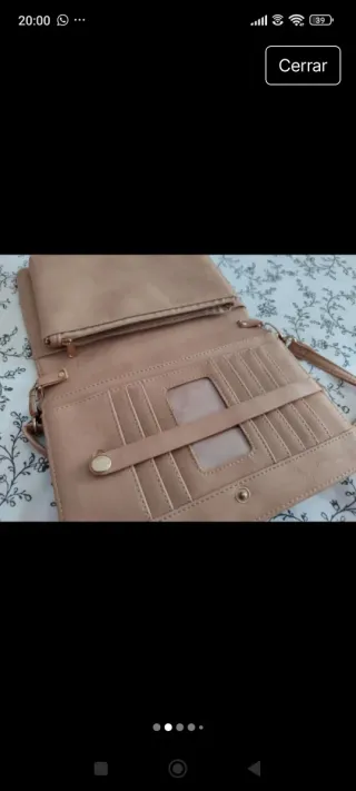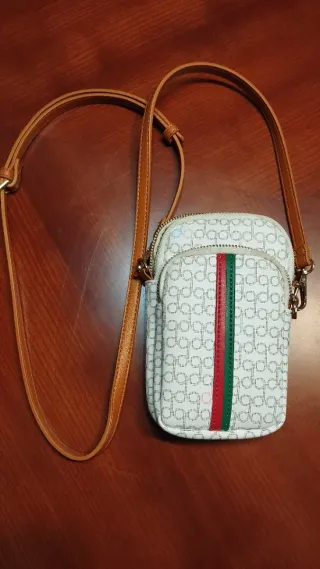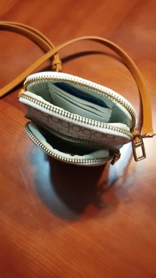 Bolso monedero de estilo moderno y práctico. - Compartimentos interiores para tarjetas. - Cierre de botón a presión. - Correa de mano desmontable.
