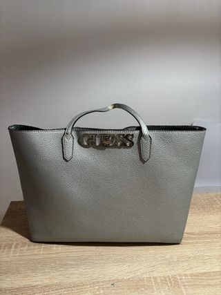 Bolso de mano Guess en color plateado con un diseño elegante y moderno. Perfecto para complementar tu estilo. - Detalle de logo metálico en la parte frontal. - Material con textura. - Asas cómodas para llevar en la mano o el antebrazo. Algun desperfecto en el asa del uso.