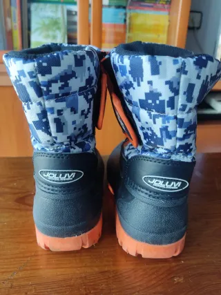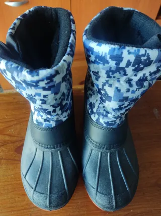Botas de nieve JOLUVI con un diseño moderno y funcional. - Parte superior con estampado de camuflaje digital en tonos azules. - Suela de goma naranja antideslizante. - Cierre de velcro para un ajuste seguro. - Interior forrado para mayor calidez. NOTA: tiene algunas marcas x roce en la franja naranja como se ve en las fotos, el resto está en perfectas condiciones