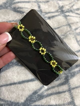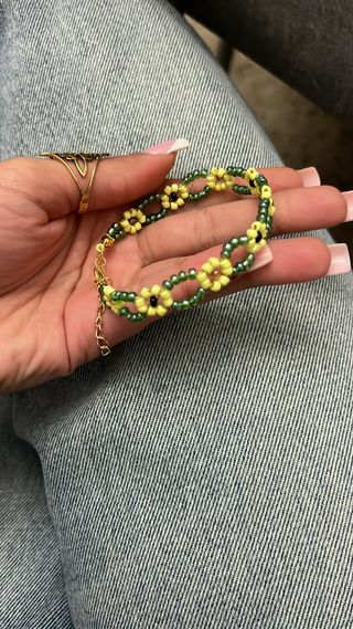 Pulsera hecha a mano con un diseño de girasoles. - Elaborada con cuentas. - Cierre de mosquetón dorado. - Hilo de alambre. - Ajustable.