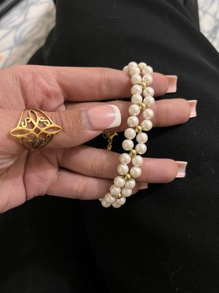 Pulsera artesanal con un diseño elegante y delicado. - Elaborada con perlas. - Detalles dorados que añaden un toque de brillo. - Diseño único y hecho a mano. - Cierre de mosquetón y cadena ajustable.