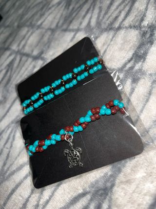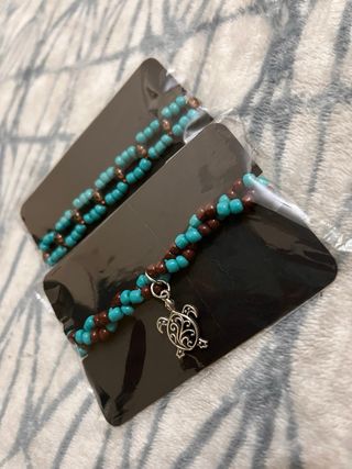 Conjunto de dos pulseras hechas a mano. - Diseño con cuentas. - Cuentas en tonos turquesa y marrón. - Una pulsera incluye un charm de tortuga. - Cierre de mosquetón tono plateado ajustable. - Hilo de alambre.