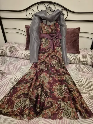 Elegante vestido largo, de boutique con estampado paisley y detalles en morado y multicolor. Incluye un lazo a juego en la cintura y una pashmina a juego. - Diseño de tirantes. - Falda con vuelo. - Pashmina de tela fina.