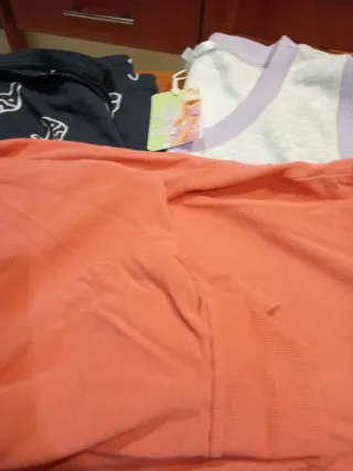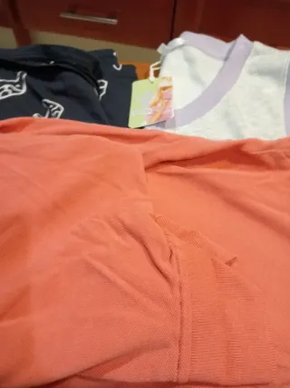 Conjunto de tres prendas de vestir. - Camisa de color naranja. - Polo de color blanco. - Chaleco de color blanco con ribete lila.