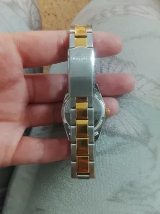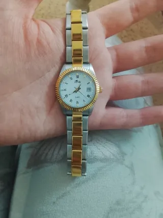 Elegante reloj de pulsera para mujer con un diseño bicolor. - Combinación de tonos dorados y plateados. - Esfera con detalles en números romanos.