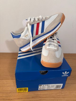Zapatillas Adidas SL 72 a estrenar. - Diseño retro con detalles en gamuza. - Tiras icónicas de Adidas en rojo y azul. - Suela de goma marrón. - Cierre con cordones blancos.