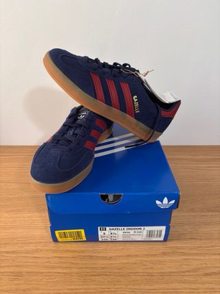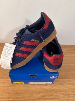 Zapatillas Adidas Gazelle Indoor en color azul marino y detalles en granate. Suela de goma.Totalmente originales con caja y etiquetas. - Modelo Gazelle Indoor. - Cierre con cordones. - Detalle de las tres bandas. - Logo de Adidas en el talón.