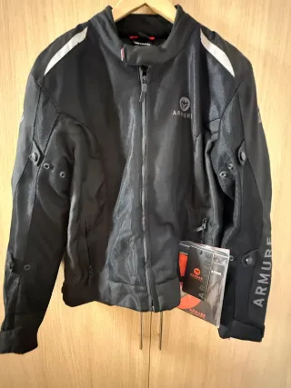 Chaqueta de moto de la marca Armure, en color negro. - Diseño textil. - Cierre de cremallera frontal. - Detalles reflectantes en hombros. - Logo de la marca en el pecho. - Protecciones desmontables en hombros y codos (nivel 2) con certificación CE. - Compartimento para poder montar un protector dorsal (no incluido).