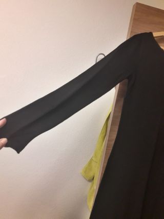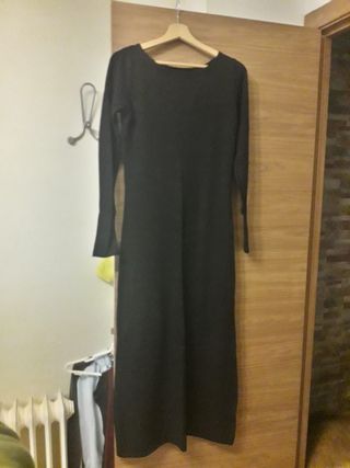 Vestido de punto negro, sin estrenar, ideal para el invierno. Medidas: 125cm de largo; 44cm de espalda; 65cm largo de manga. Material: viscosa, nylon y cachemira.