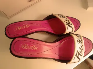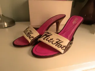 Elegantes zapatos de tacón para mujer con un diseño llamativo. - Tira frontal con detalle de texto. - Interior en color rosa vibrante. - Tacón de aguja.