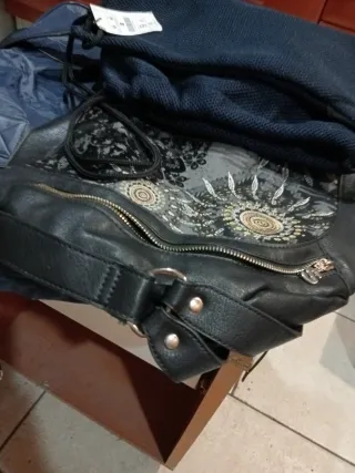 Bolso bandolera de estilo casual, sin estrenar, perfecto para el día a día. Su diseño combina un acabado liso con detalles de flecos. El largo de la correa es ajustable. Cuenta con un bolsillo con cierre de cremallera en la solapa. Medidas: 21cm de alto; 24cm de ancho.