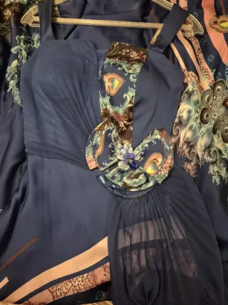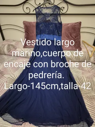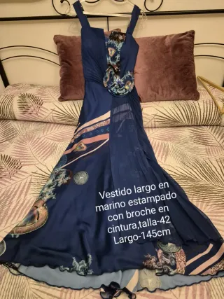 Vestido largo azul marino con estampado y un bonito broche en la cintura. El largo es de 145cm. - Diseño estampado. - Broche decorativo en la cintura. - Largo: 145cm.