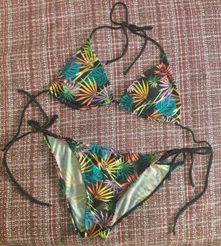 Bikini con estampado de palmeras, sin estrenar, talla S aprox. Relleno extraíble para facilitar el lavado. Forro negro en la parte anterior de la braguita para que no se transparente. Bolsita impermeable de transporte y guardado. Medidas: 19cm cada lado de los triángulos; anchura de la braguita regulable con las tiras. ¡Ideal para preparar el verano!