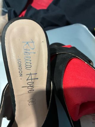 Elegantes sandalias de tacón alto de la marca Rebecca Hope London - Tacón gordo y cómodo - Detalle de lunares en tacones - Material exterior de ante.