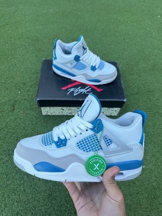 Zapatillas Jordan 4 Military Blue con un diseño icónico. - Combinación de colores blanco y azul. - Detalles en gris.