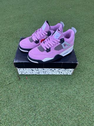 Zapatillas Jordan 4 en un llamativo color lila. - Diseño moderno y deportivo. - Detalles en gris y blanco.