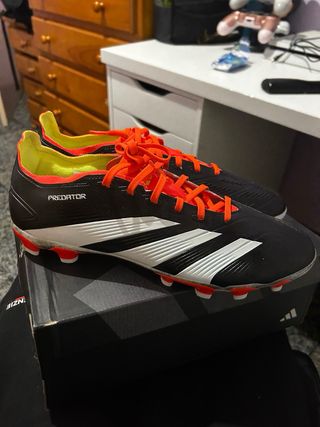 Botas de fútbol Adidas Predator de gama media. - Color principal negro con detalles en rojo y blanco. - Diseño Predator característico de Adidas. Tienen dos usos, en persona puedes ver que estan en perfecto estado