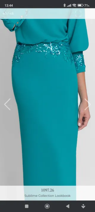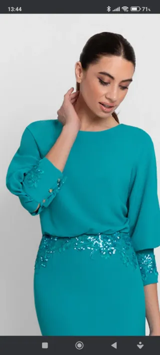 Elegante traje de fiesta o para madrina, con un bonito diseño. - Color verde azulado (teal). - Adornos de pedrería y encaje en cintura y mangas. - Mangas abullonadas con detalle de botones.