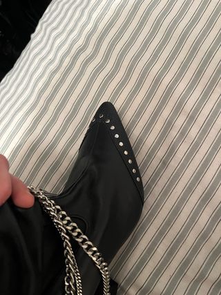 Botas de tacón elegantes y modernas, a estrenar. - Diseño con punta afilada. - Adorno de tachuelas metálicas. - Cadena decorativa plateada.