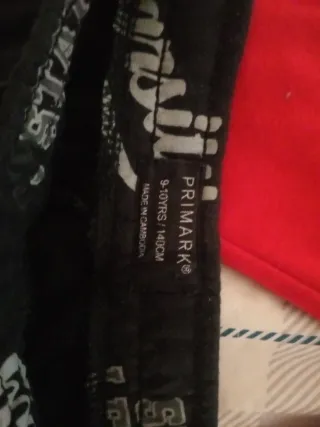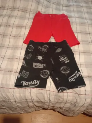 Conjunto de dos pantalones cortos para niños. - Un pantalón es de color rojo. - El otro pantalón es negro con estampado. - Talla 9-10 años (140 cm).