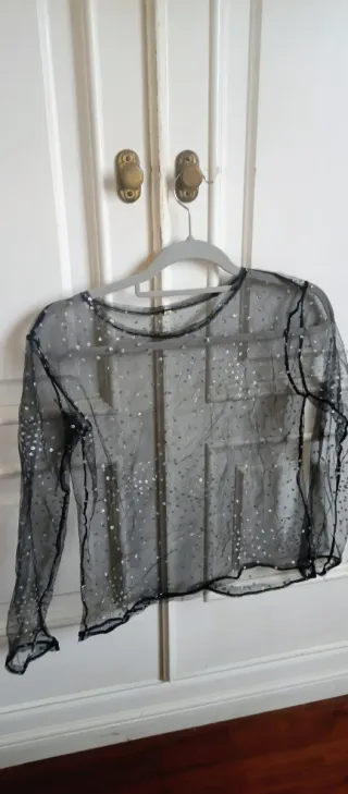 Camiseta de manga larga con un diseño de tul negro adornado con pequeños lunares plateados. Es una prenda ligera y con un toque brillante. - Tejido de tul transparente. - Estampado de lunares plateados. - Manga larga.
