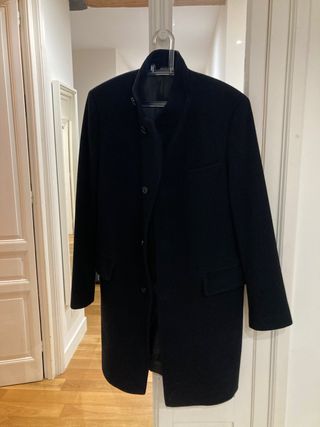 Elegante abrigo de paño de la marca Hugo Boss. - Color negro. - Diseño clásico y atemporal. - Cierre de botones. - Bolsillos frontales.