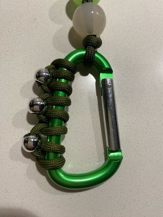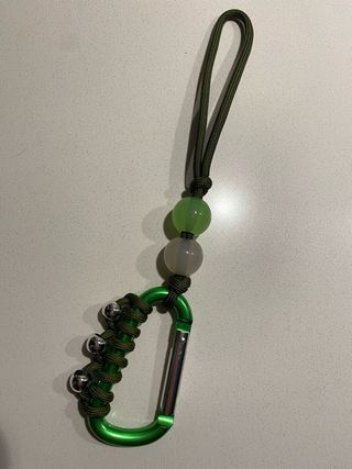 Llavero decorativo con un mosquetón metálico y detalles de cuerda. - Mosquetón de color verde. - Cuerda de color verde oscuro. - Tres cuentas decorativas: dos esféricas translúcidas y una plateada. - Anilla para colgar.